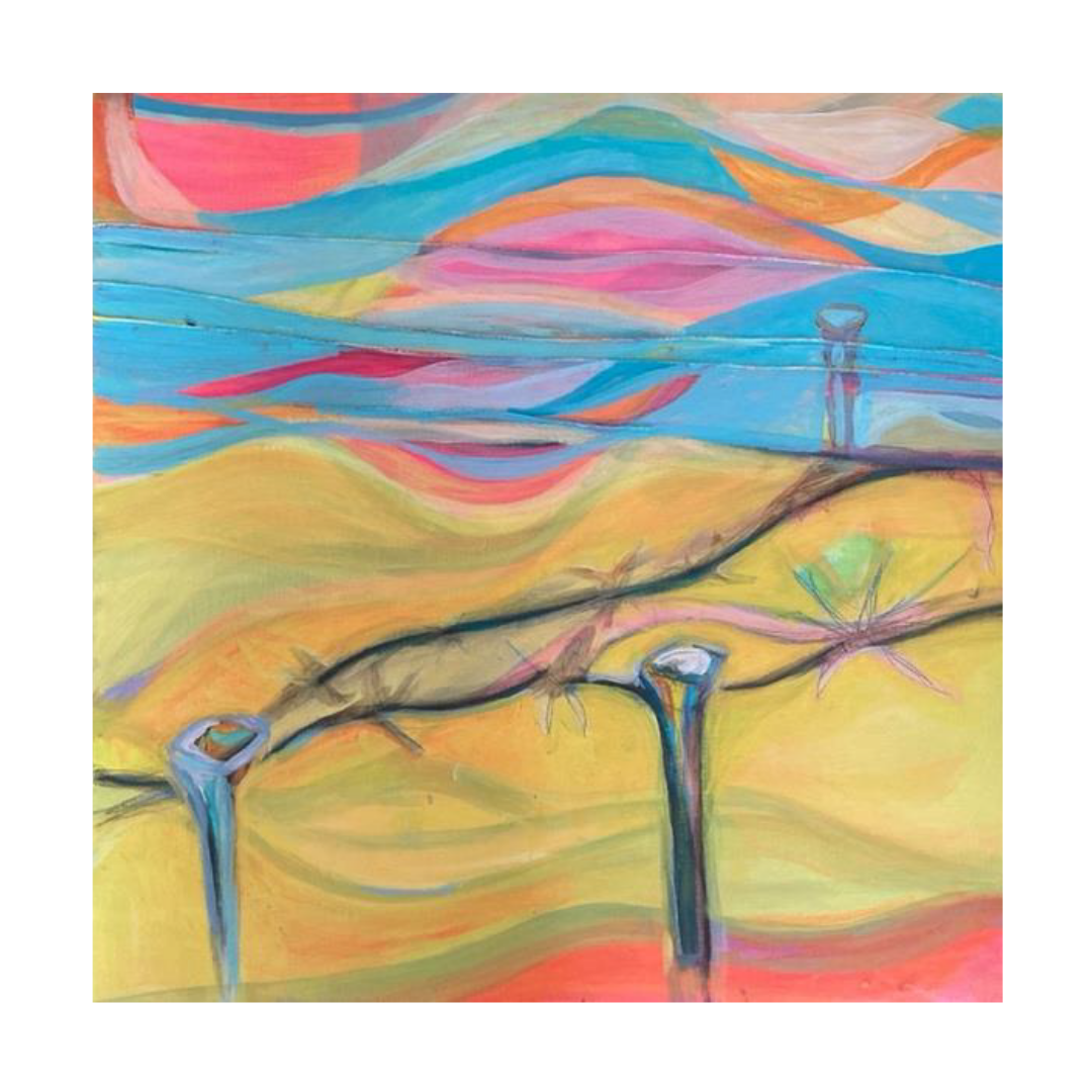 Evoking the surreal wonder of childhood, *Standing on Ditches* captures the moment of seeing the world unfold beyond rural hedges. With expressive colourwork in blue, ochre, and pink, this painting is a bold, emotive piece layered with memory and dreamlike movement. An original work by Irish artist Sinead McCarthy, featured in *House & Garden Interiors UK 2025*.