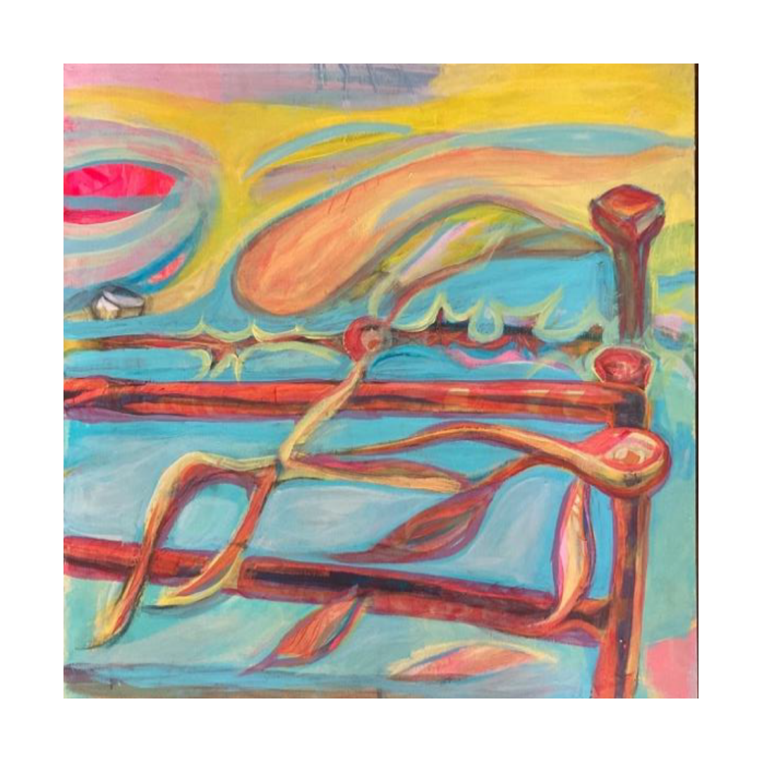 A moody dusk settles over the Bricky River in this evocative painting. *Standing on Rusty Gates* brings together themes of memory, rural life, and twilight atmosphere in Sinead McCarthy’s signature expressive style.